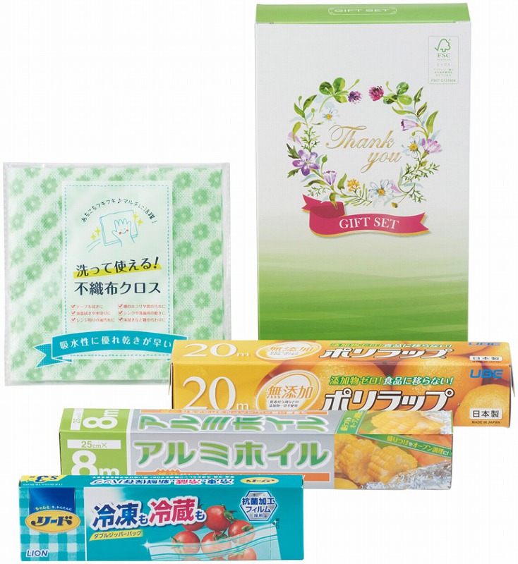 スポンジ・台所用洗剤・ラップ・アルミホイルなどのギフトセットをまとめたカテゴリです。500円以下の販促品・景品向け、1000円以上の記念品向け、2000円以上のギフト向けなどご用意しております。