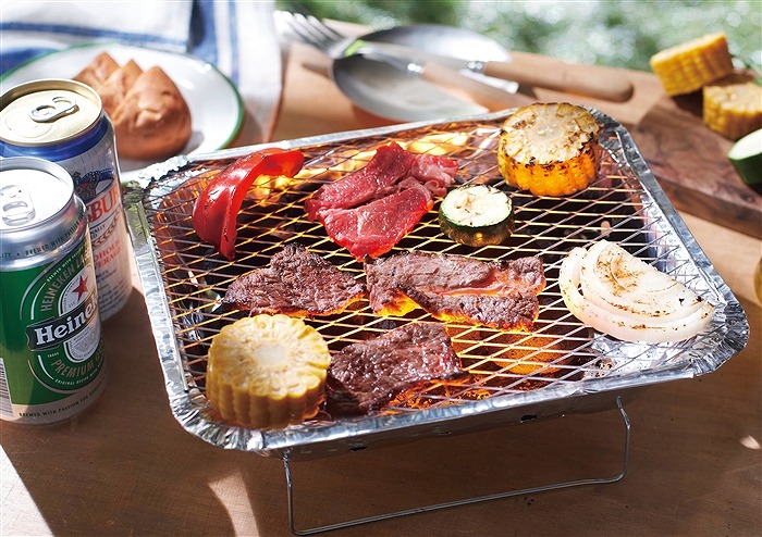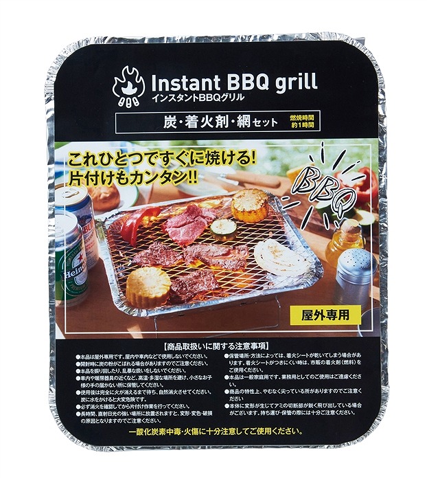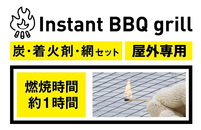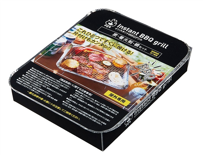 燃料や網などがセットになっている、インスタントグリル(少人数用)。コンパクトにまとまったセットは、持ち運びが手軽。火起こしに必要な着火剤や燃料・網が付属していて、すぐに使うことが出来ます。燃焼時間は約1時間。 災害時などの非常用にも便利です。