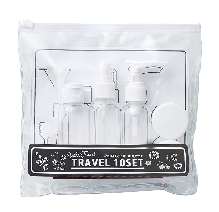 収納ポーチ/約19.5×19.5cm プッシュポンプボトル/直径3.2cm 高さ11.9cm(容量/約50ml) スプレーボトル/直径3.2cm 高さ11.4cm(容量/約50ml) ワンタッチキャップボトル/直径3.2cm 高さ9.3cm(容量/約50ml) クリームケース/直径3.9cm 高さ2.2cm(容量/約17g) じょうご/全長3.9cm スポイト/全長6.3cm ヘラ/全長8.2cm 使い分けラベルシール/10×2cm