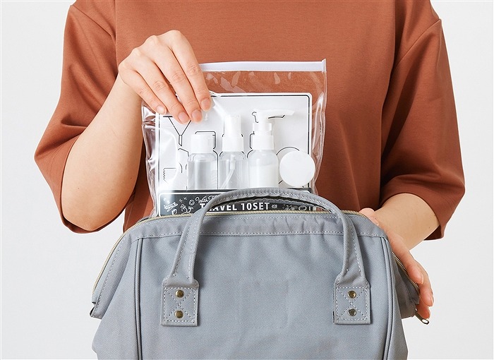 収納ポーチ/PVC・ポリプロピレン プッシュポンプボトル・スプレーボトル・ワンタッチキャップボトル/ボディ:PET ヘッド:ポリプロピレン・ポリエチレン クリームケース/ボディ:ポリスチレン フタ:ポリプロピレン じょうご/ポリプロピレン スポイト/ポリエチレン ヘラ/ポリプロピレン
