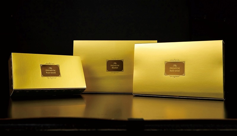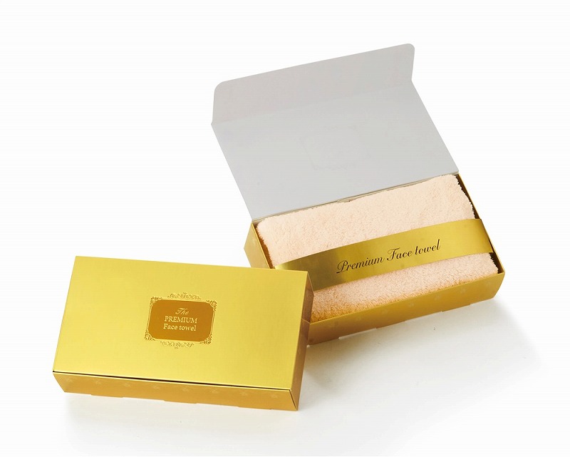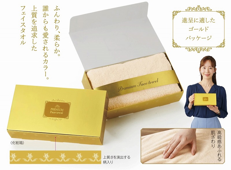 まばゆいばかりのゴールドの化粧箱は、サイドにまでデザインを施したこだわりの仕様。「もうこのタオルしか使いたくない!」と思えるような極上の使い心地で、特別なお客様にこそ差し上げたい逸品です。
