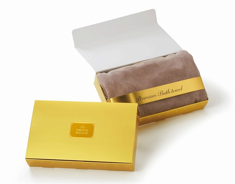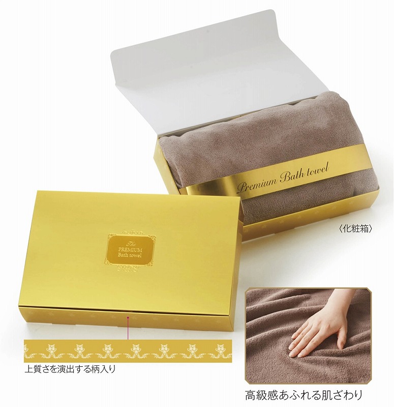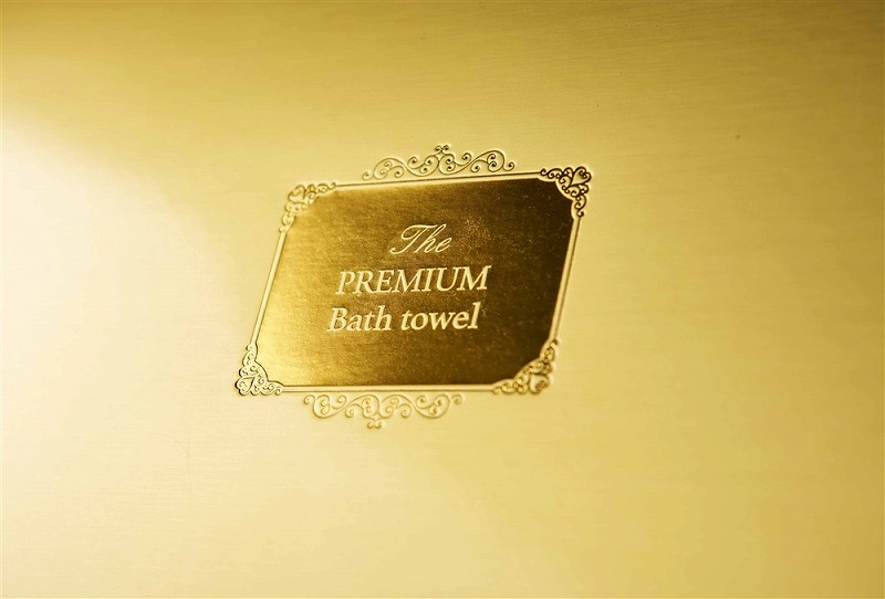 まばゆいばかりのゴールドの化粧箱は、サイドにまでデザインを施したこだわりの仕様。「もうこのタオルしか使いたくない!」と思えるような極上の使い心地で、特別なお客様にこそ差し上げたい逸品です。