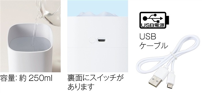 <セット内容> ・USBケーブル×1 ・吸水芯×2(予備含む) 電源/DC5V 400mA-800mA 容量/約250ml