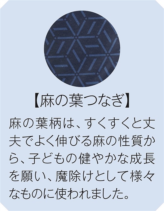 「文様百趣」は古来から受け継がれてきた伝統文様の美しさとメッセージを未来へ伝えるデザインブランドです。 『麻の葉つなぎ』…麻の葉柄は、すくすくと丈夫でよく伸びる麻の性質から、子どもの健やかな成長を願い、魔除けとして様ーなものに使われました。