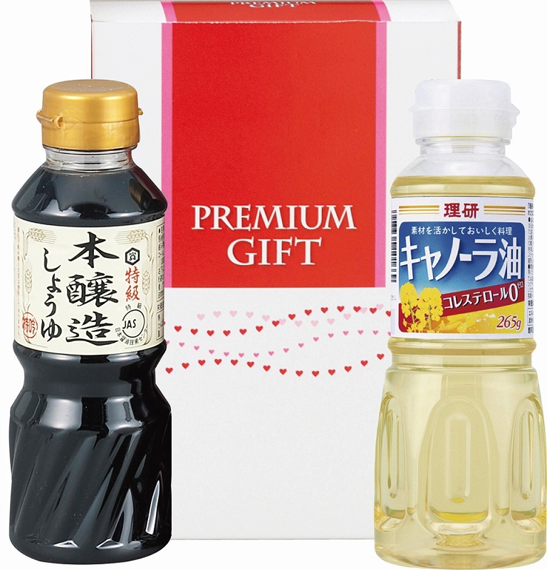 オレイン酸たっぷりのキャノーラ油と、特級本醸造醤油の貰って嬉しいセットです。