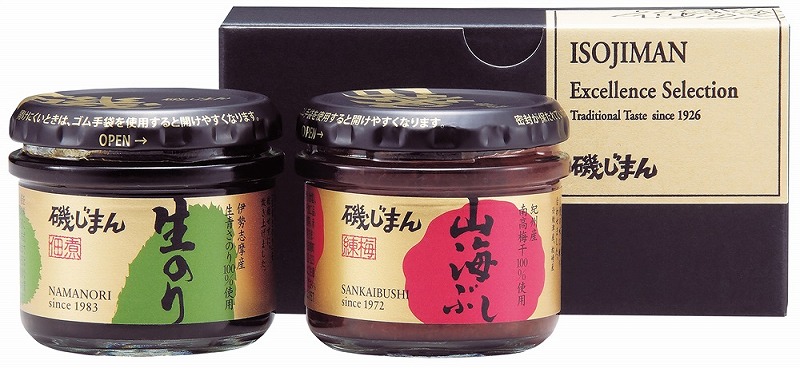 生のりは、伊勢志摩地方で養殖された「青さのり」を新鮮な生のまま冷凍保存し、風味豊かにマイルドな味付けで炊き上げました。山海ぶしは、紀州産の南高梅干しのペーストに国産鰹節と紫蘇を和えた梅干しの加工品です。梅干しより食べやすく、美味しく調味されています。おにぎり、お茶漬けはもちろん焼鳥やチキンソテーのソース等にもよく合います。