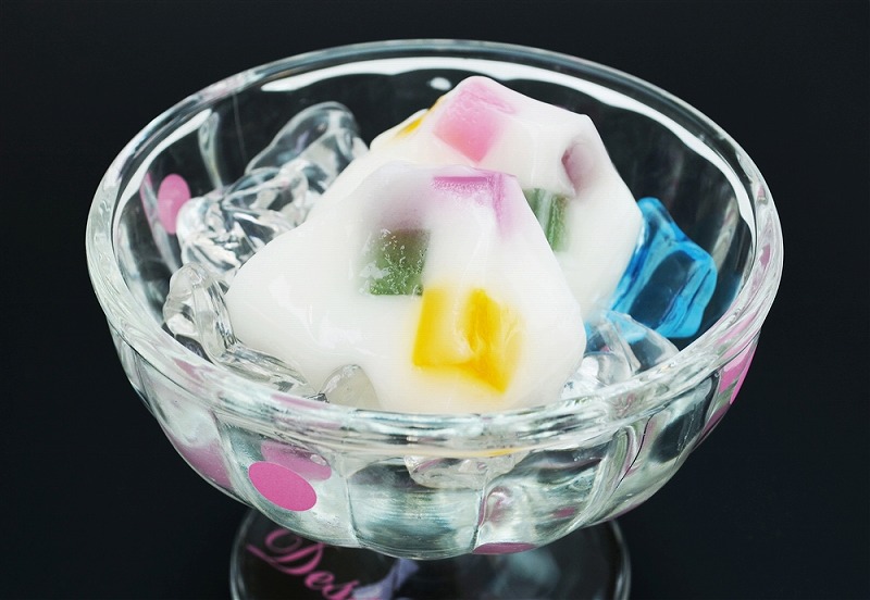 練乳ベースの白いプリンに、かき氷のしろくまのトッピングでもおなじみのみかん・メロン・いちご・小豆の角切りゼリーを入れました。みかんダイスには、世界最小と言われる「桜島小みかん」ジュースが使用されています。