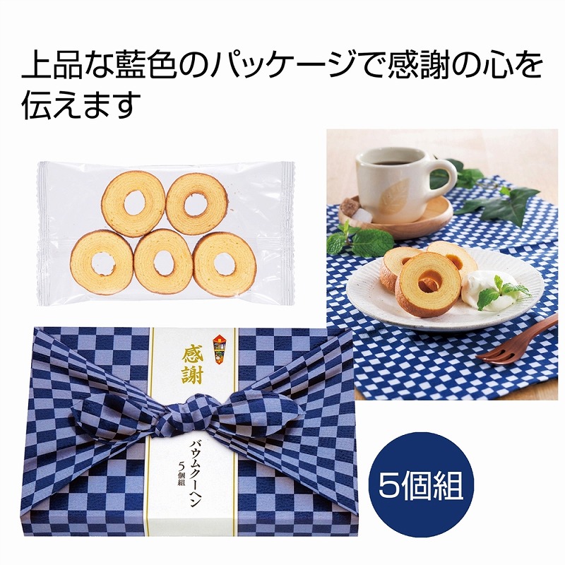 国内産小麦を使用し、職人が丹精込めて焼き上げたしっとり系バウムクーヘン。王道のプレ-ン味のバウムを食べやすい一口サイズにカットしました。上品な藍色をあしらったパッケージで感謝の心を伝えます。
