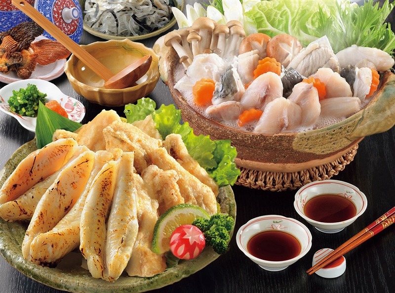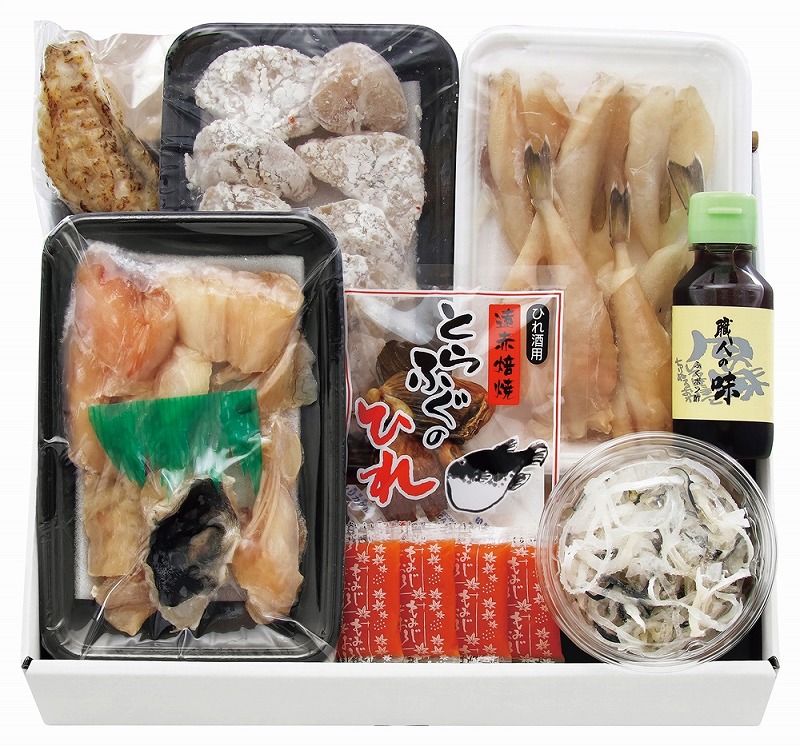 <セット内容> ふくちり200g(シロサバフグ切身・トラフグアラ 各100g)、ふぐ唐揚げ(骨付)200g、ふぐ一夜干し150g、ふぐたたき1本、とらふぐ皮60g、とらふぐ焼ヒレ5g(ポン酢・もみじおろし付)