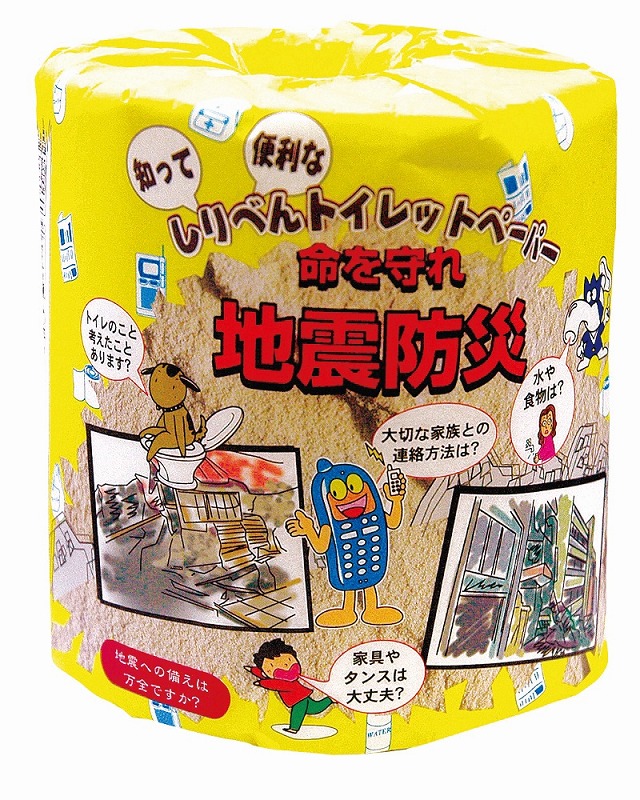 地震災害時、トイレは?水は?地震防災に関するお役立ち情報をトイレットペーパー本体に印刷しています。日本は地震大国です。イベント会場内で積み上げると、インパクトがあるディスプレイとして映えます。官公庁主催のイベントで配布する啓発グッズとして最適です。また、季節問わず景品・来店者プレゼントとしてもご活用いただけます。