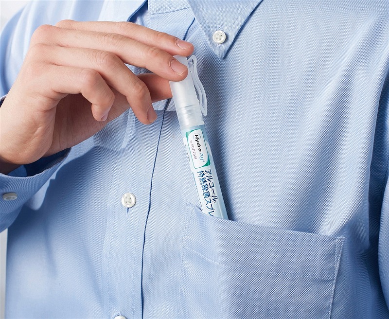 携帯しやすく、気になるところにシュッと噴霧。60%の高濃度アルコールで除菌、乾いたあとも銀イオンが抗菌するHydroAg+技術で作られたスプレーです。 ※オリジナルラベルも対応致します。お問合せください。