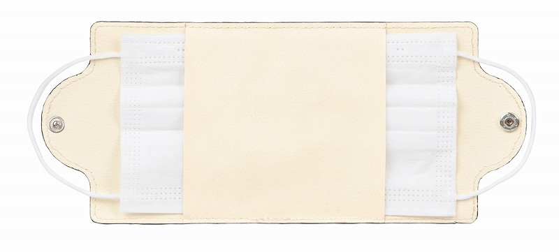 内側の仕切りにマスクを通してボタンで閉じて使用します。表側には大きく名入れスペースを取れます。厚さ約0.6cm/重量約45g(※必ず現品でご確認ください)でポストインに最適。
