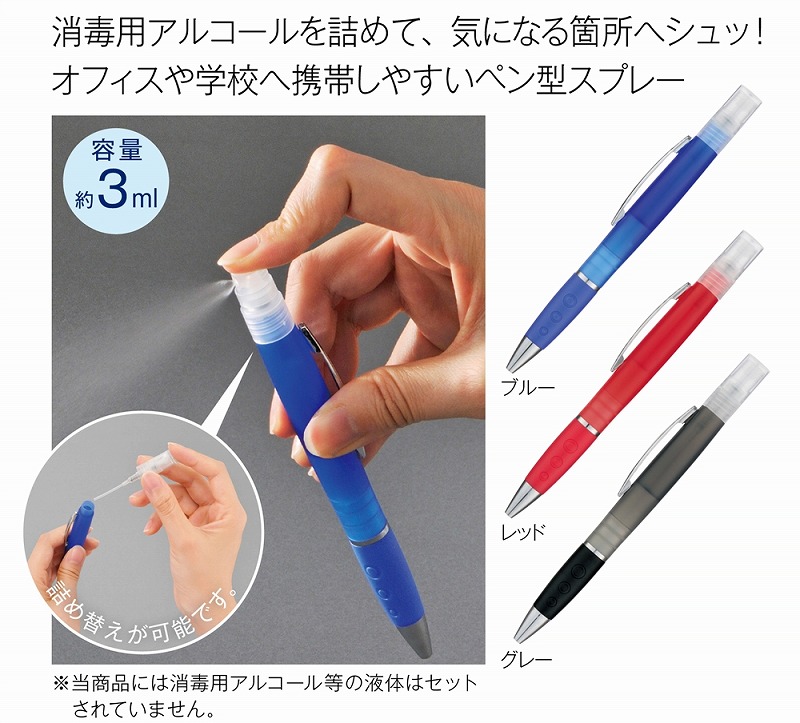 オフィスや学校で携行しやすいペン型スプレー。詰め替えが可能です。※納品時には消毒用アルコールなどの液体は充填されておりません。
