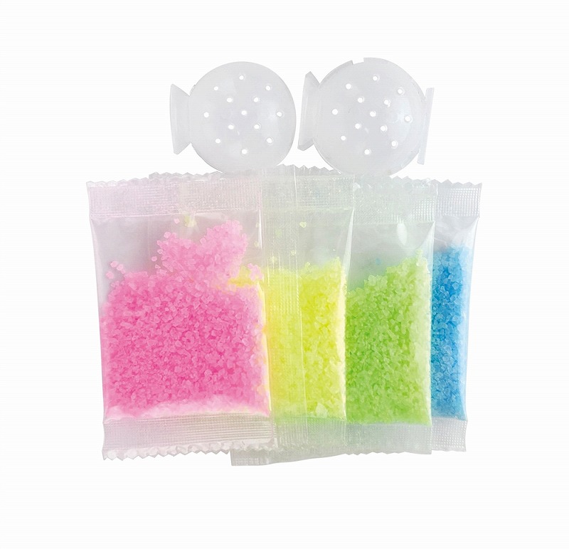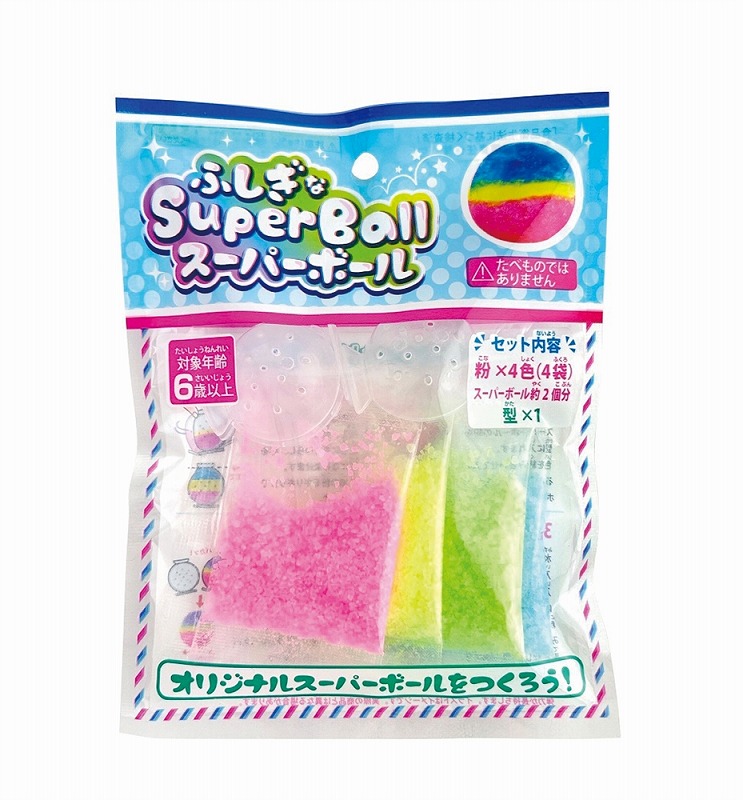 専用の粉を付属の型に入れて水に漬けるだけ。色を混ぜて自分だけのオリジナルスーパーボールを作ることができます。
