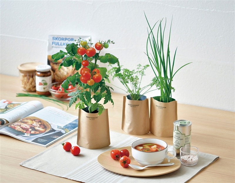 窓辺やキッチンで育てるのにちょうどいいサイズのクラフトペーパーバッグで、スープにピッタリの野菜を種から育てることができます。
