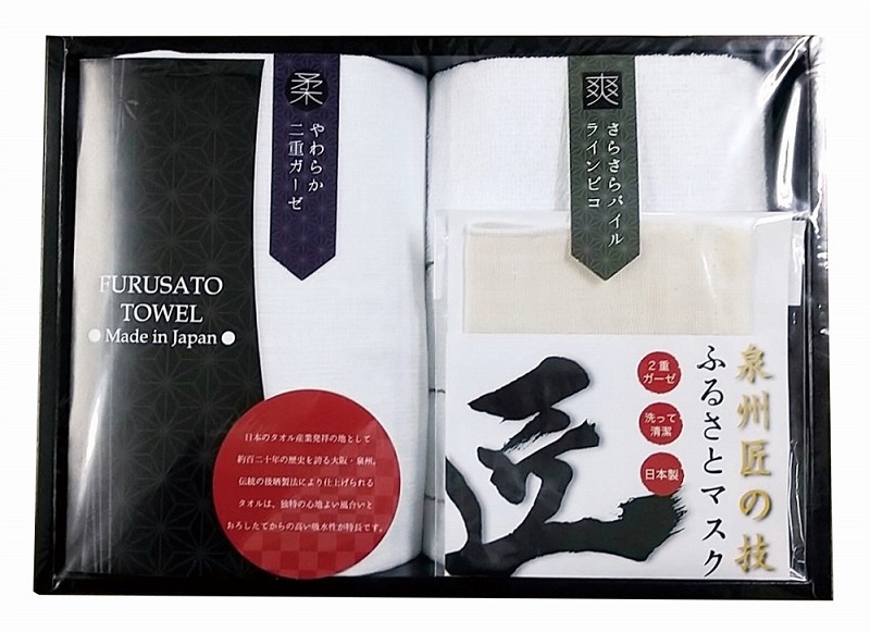 <セット内容> パイルウォッシュタオル×1 二重ガーゼウォッシュタオル×1 泉州匠の技ふるさとマスク×1