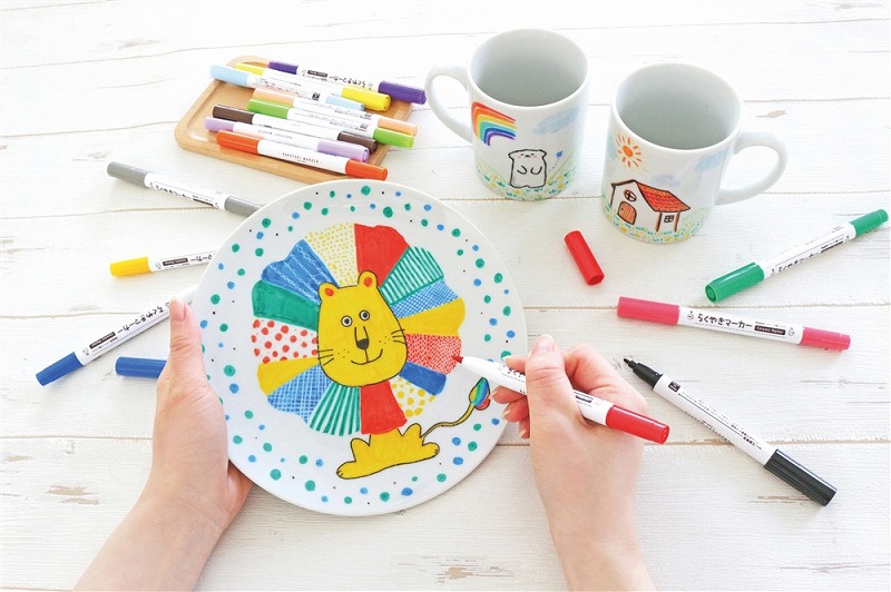 お好きなイラストをかいてオーブンで焼くだけで簡単にオリジナルアイテムが作れます。(加熱時間:200℃→25分、230℃→20分)完成したお皿は付属のスタンドで飾ってもヨシ、もちろん毎日使ってもヨシ!思い出がいっぱい詰まった一皿になります。らくやきマーカーはガラスや金属にも同様に焼き付けることができます。※完成品は食洗機には使用できません。