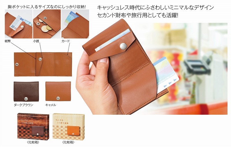 胸ポケットに収まるサイズなのに、紙幣・小銭・カードもしっかり収納可能。女性も使いやすいブラウンカラーのアソートです。ギフト感のある化粧箱とコスパにもご注目。