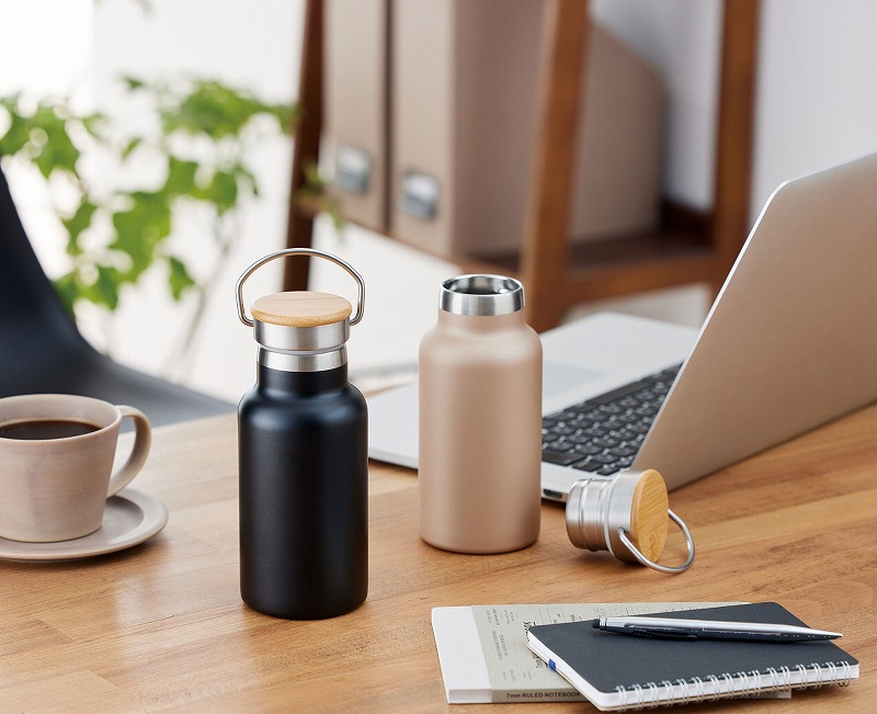 竹の温かみとステンレスの高級感が合わさった、持ち運び便利なステンレスボトル。