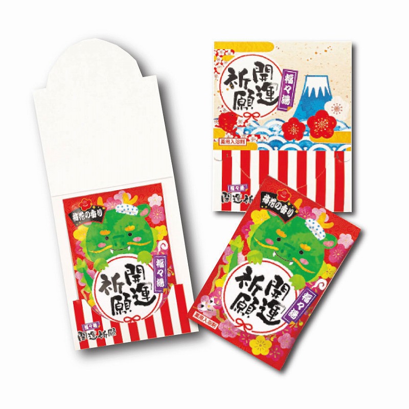 干支(寅)柄パッケージの入浴剤1包入り。梅花の香り。タトウ式ケース入り