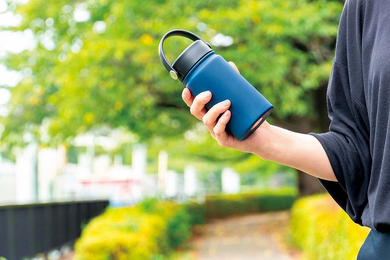 持ち運びに便利なハンドル付きのステンレスボトル。