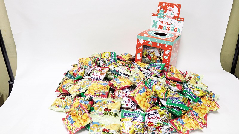 ○セット明細 ・人気スナック菓子…合計約150個 (うまい棒…約30個)(キャベツ太郎…約30個) (たまねぎ太郎…約30個)(もろこし輪太郎…約30個) (ベビースター…約30個) ・お持ち帰り袋…100枚 ・サンタボックス・・・1ヶ