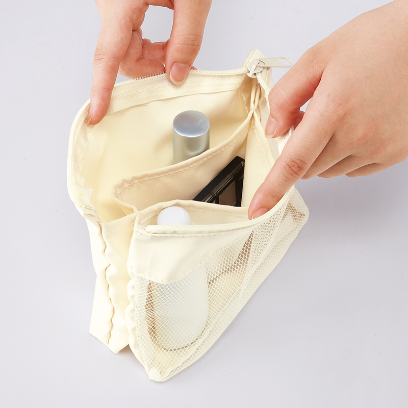 ポーチの中でごちゃつきがちな小物類が見映えよく収まる3室構造のスマートポーチ。