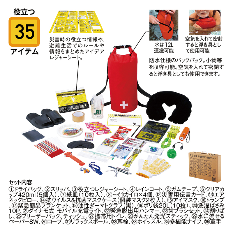 いざという時の備えは、日頃から万全にして”安心”も一緒に備えておきたいもの。あらゆる非常時を想定したボリューム感あるセットなので、オリジナリティと特別感のあるノベルティになります。企業や会社の販促品・ノベルティでお困りの場合、オシャレで安いオリジナルのものをご提案します。