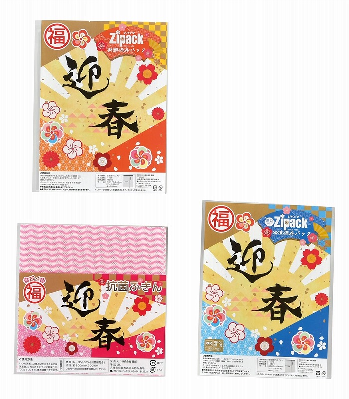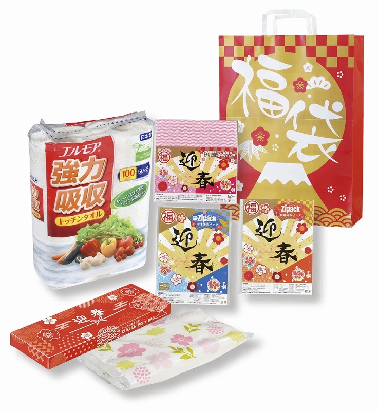 [セット内容] ●エルモアキッチンタオル2ロール×1 ●ソフトパック入りティッシュ60W×1 ●迎春キッチン用ポリ袋10枚BOX×1 ●迎春ジパック(冷凍)1枚入×1 ●迎春ジパック(冷蔵)1枚入×1 ●拭く拭く福ふきん(抗菌)×1
