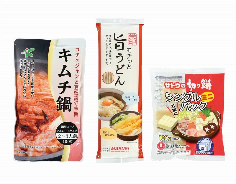 [セット内容] ・キムチ鍋つゆ400g×1 ・モチっと旨うどん200g×1 ・サトウの切り餅シングルパックミニ100g×1