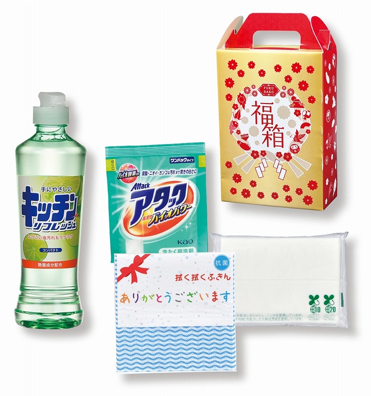 [セット内容] ・キッチンリフレッシュコンパクト270ml×1 ・花王 アタック24g×1 ・抗菌拭く拭くふきん1枚×1 ・バイオマスポケットティッシュ8W×1