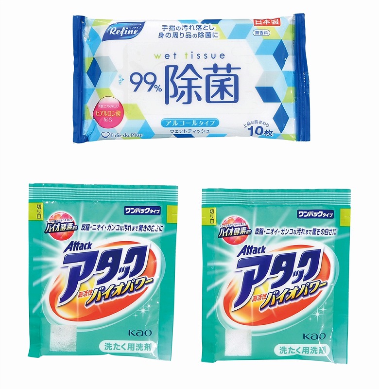 [セット内容] ・キッチンリフレッシュコンパクト270ml×1 ・花王 アタック24g×2 ・リファイン アルコール除菌ポケットウェットティッシュ10枚×1 ・ネットクリーナー×1