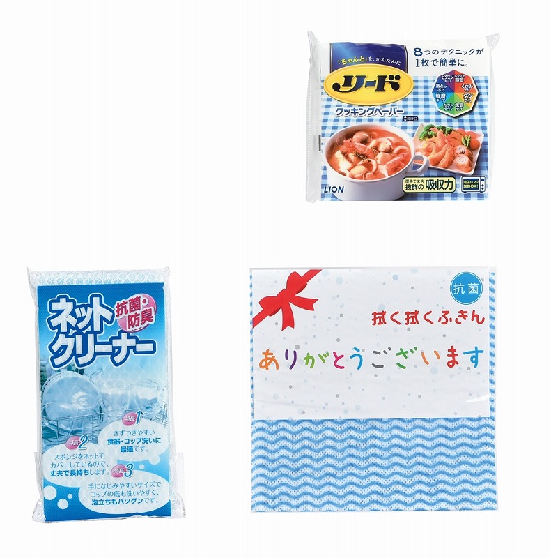 [セット内容] ・ライオン チャーミーグリーン260ml×1 ・ライオン トップスーパーNANOX10g×1 ・ライオン リードクッキングペーパー小4枚×1 ・ライオン キレイキレイ除菌ウェットシート1枚(アルコール)×1 ・抗菌拭く拭くふきん1枚×1 ・ネットクリーナー×1