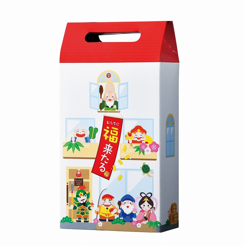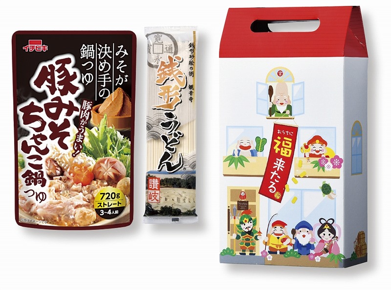 七福神のイラストがモチーフの可愛らしいデザインの福箱に、人気のちゃんこ鍋つゆと乾麺のうどんを詰め合わせました。