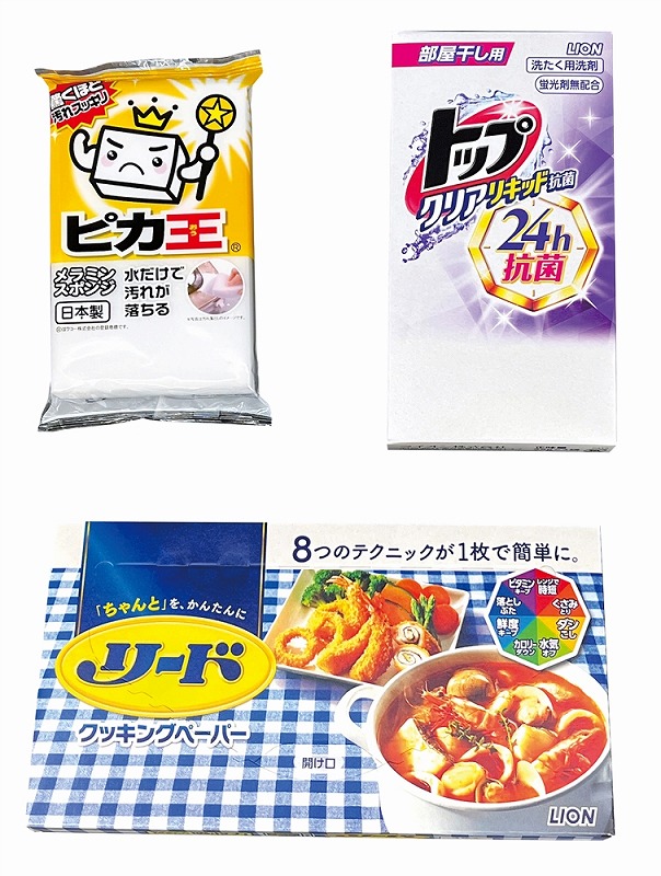 [セット内容] シンプルエコティッシュ100W×1 リード クッキングペーパーS(4枚)×1 トップ クリアリキッド抗菌(2包)×1 ピカ王ミニ×1