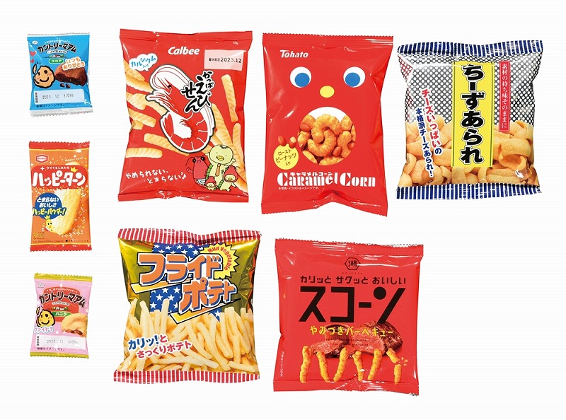 [セット内容] カルビー かっぱえびせん26g×1 東ハト キャラメルコーン20g×1 湖池屋 スコーンやみつきバーベキュー22g×1 不二家 カントリーマアムココア(1枚)×1 不二家 カントリーマアムバニラ(1枚)×1 若鳩 フライドポテト10g×1 アジカル ハッピーターン(1枚)×1 カクダイ クッピーラムネ4g×1 若鳩 ちーずあられ10g×1 やおきん 蒲焼さん太郎(1枚)×1