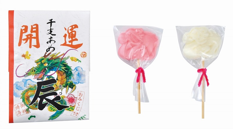 2024年の干支「辰」を模った紅白の干支飴です。干支の絵柄のオリジナル袋に、ミルク味(白)と苺ミルク味(赤)の棒付き干支飴が入っております。同時にその袋は「おみくじ」となっており、楽しさも演出しております。新年のご挨拶、お年賀、記念品、プチギフトとして毎年多くの方にご利用いただいております。