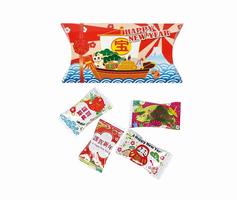 お正月柄のプレゼントボックスに、迎春柄のキャンディを4個詰めたお手頃価格の商品です。