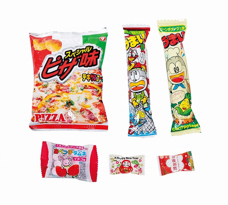 [セット内容] テキサスコーンピザ味×1 うまい棒×2 あべっ子ラムネ×1 迎春キャンディ×2