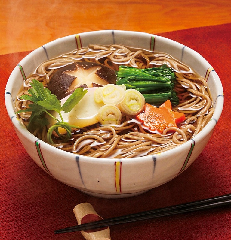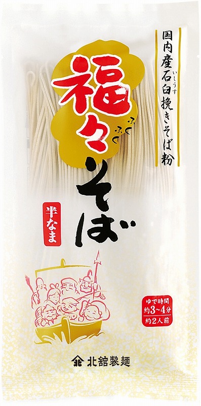 七福神イラストのおめでたいパッケージデザインが目を引く商品です。生そばに近いのど越しと風味の半なまタイプのそばです。そばの形状が細くて長いことから長寿を願ったり、そばの実の形が邪気を払う三角の形をしていること、植物としてのそばは風雨に強いことにあやかって等、昔からそばは縁起物とされ親しまれています。玄そばをじっくりと石臼で挽くことで、そばの香りが活きています。