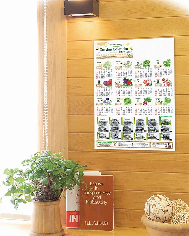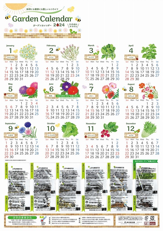 「花」「野菜」「ハーブ」合計12種類の種付きカレンダー。 メッセージや広告を入れることで、1年通してPRすることができます。 種の種類 1月:カモミール 2月:タイム 3月:ルッコラ 4月:バジル 5月:アスター 6月:朝顔 7月:ポピー 8月:なでしこ 9月:矢車草 10月:リーフレタス 11月:ラディッシュ 12月:みずな