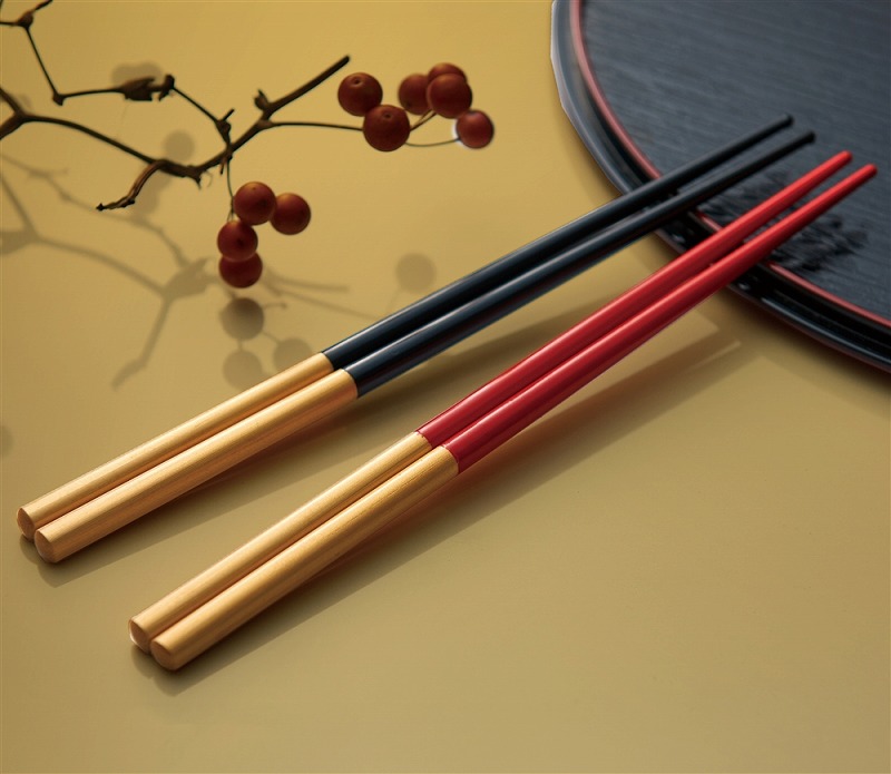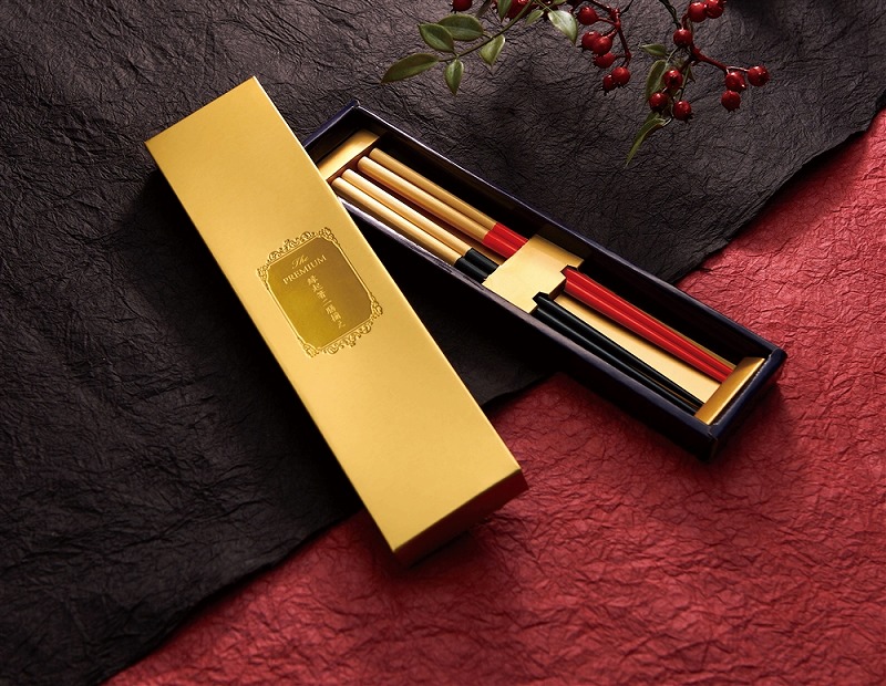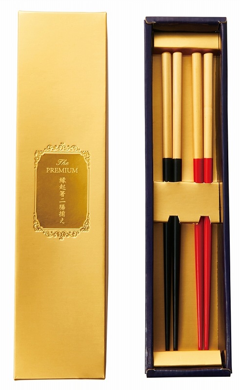 箔押しが施された金色の化粧箱に設えたあでやかな夫婦箸はインパクトも抜群。慶事のギフトに最適です。