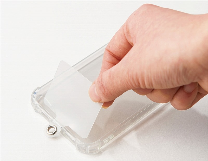 スマホの本体とカバーの間にシートを挟み、ケーブル穴から凸部分を出してセットします。お渡ししやすい軽さとサイズも魅力的!