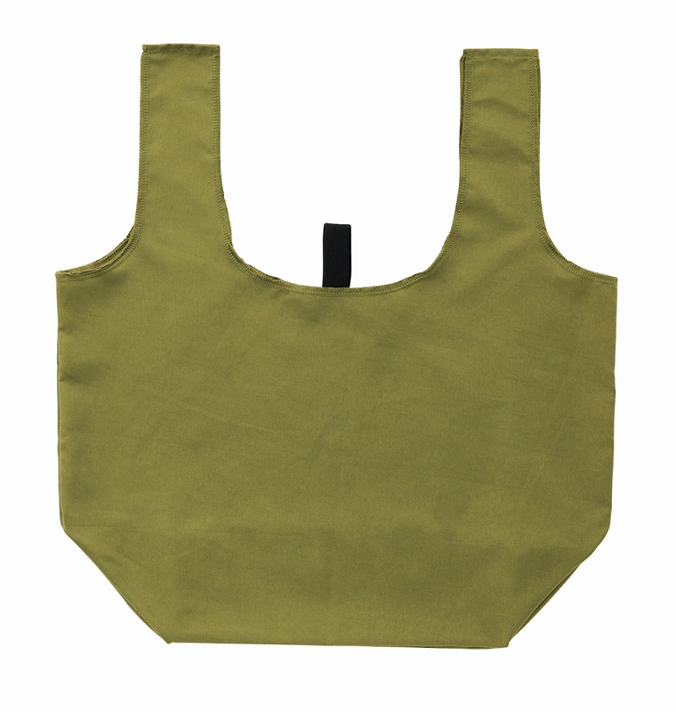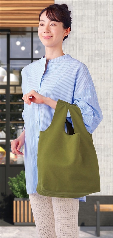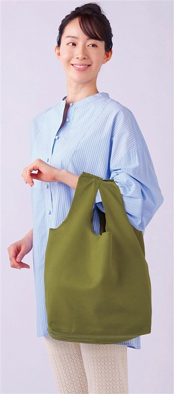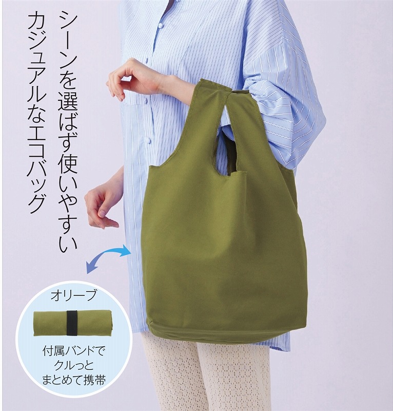 底マチもついて毎日のお買い物にちょうどいいサイズ感。付属のバンドでくるっとまとめて小さく携帯できます。