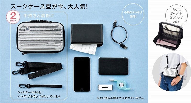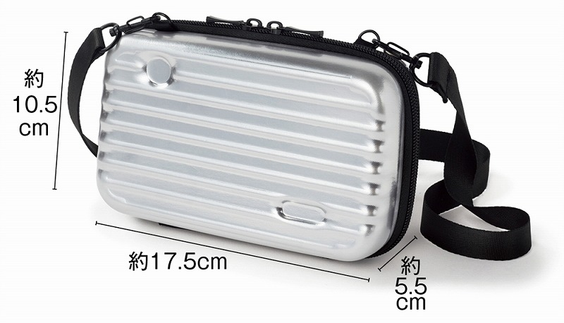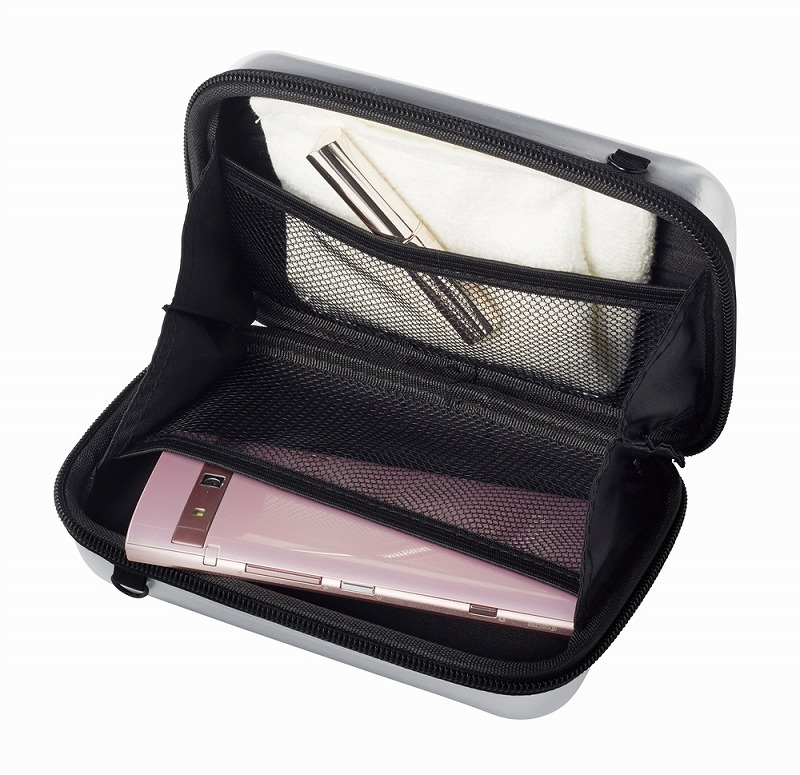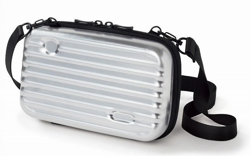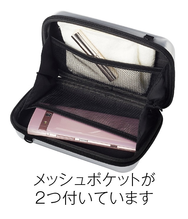 傷から守りたいガジェット類や散らかりがちな小物の持ち運びに。ファスナーを開けると内側に2つのメッシュポケット付き。ショルダーベルト&ハンディストラップ付きです。