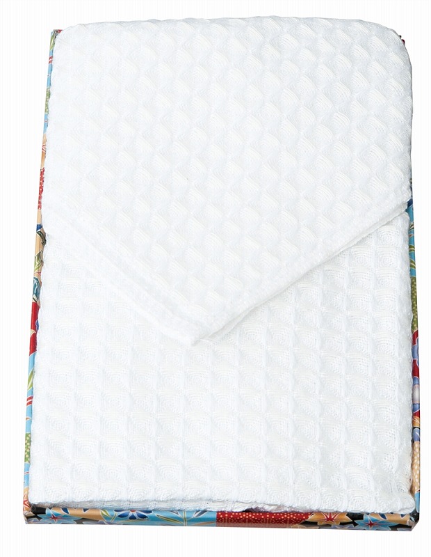 回収された使用済ペットボトルを原料とし、マテリアルリサイクル工程を経て生産されたポリエステル繊維を約60%使用したリサイクルポリエステルファイバーです。(500mlペットボトル約2本分でふぇいすたおる1本分になります)タオルはワッフル織りで伸縮性に優れており吸水性が高くやわらかな特性があります。華やかな和柄のデザインの化粧箱入り。
