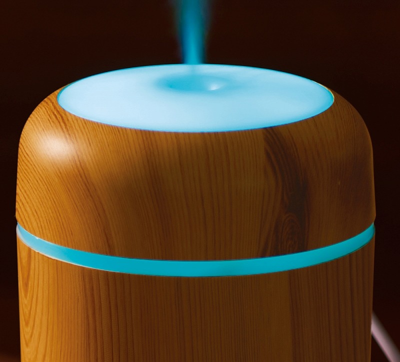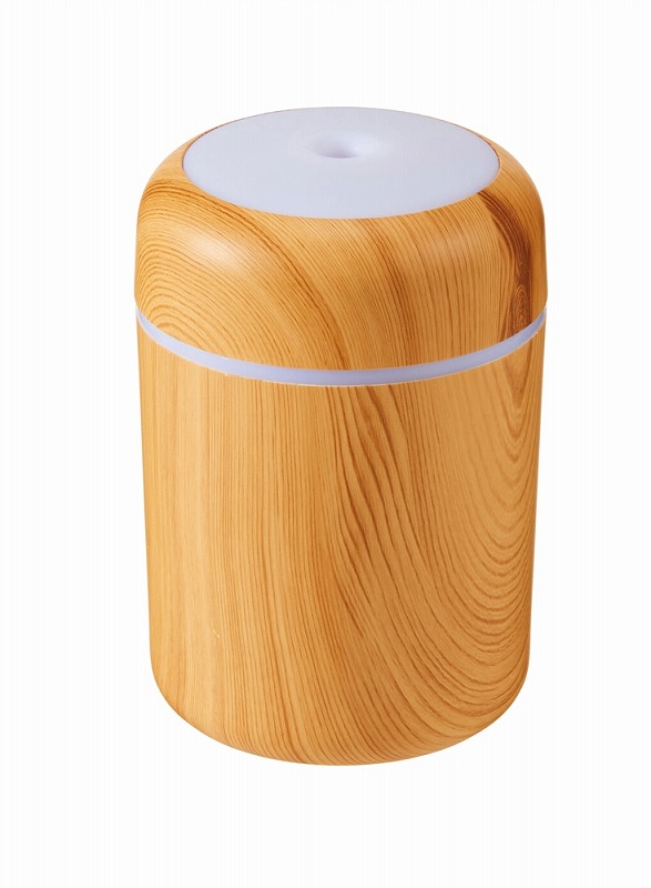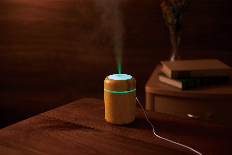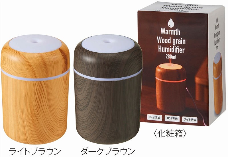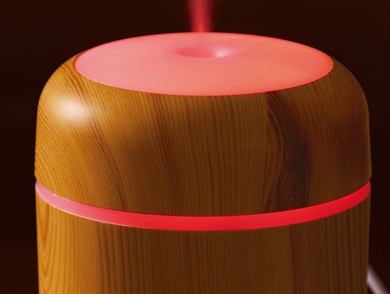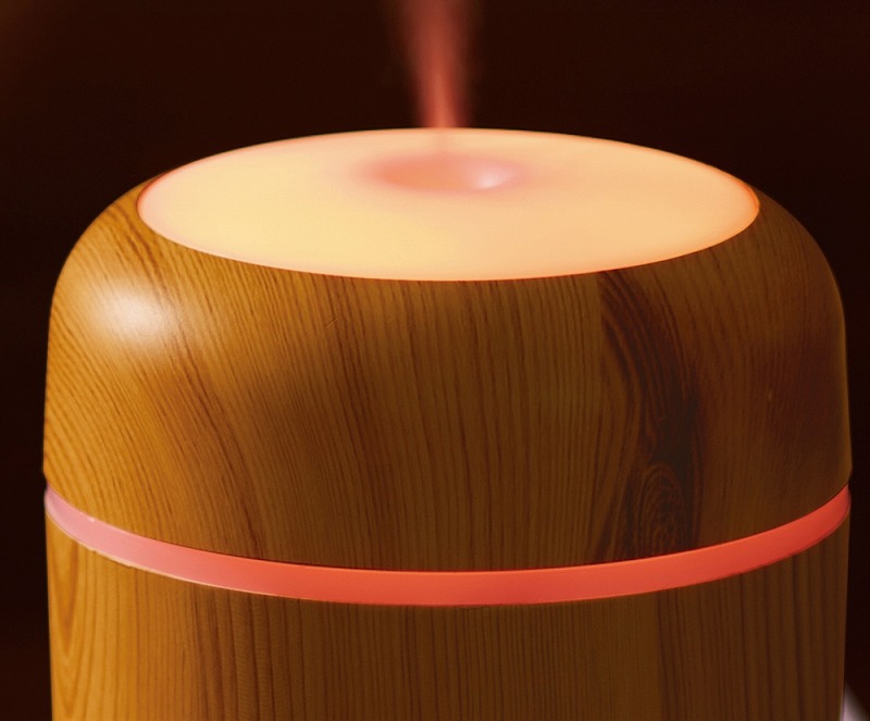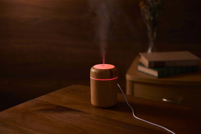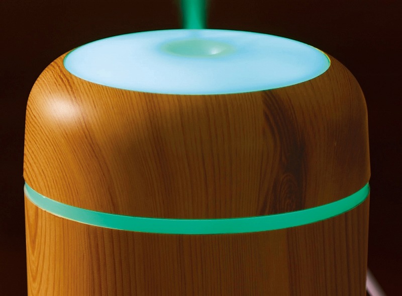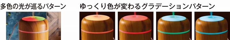 お肌やのどの乾燥対策に必須な加湿器。使用中、本体上部は多色の光が巡るパターンと、ゆっくり色が変わるグラデーションパターンで光ります。本体はナチュラルとダークな2色の木目調カラーのアソート。