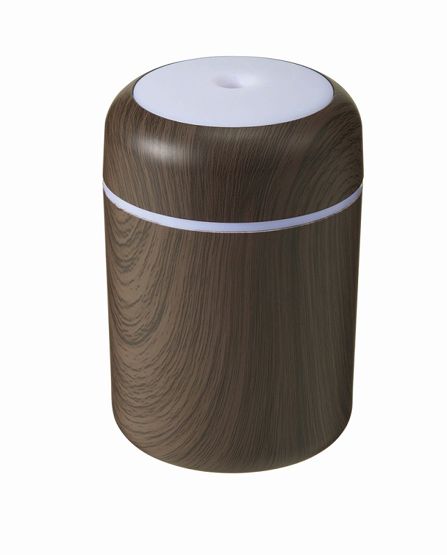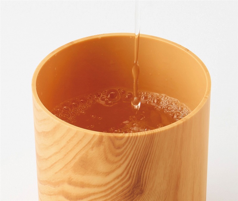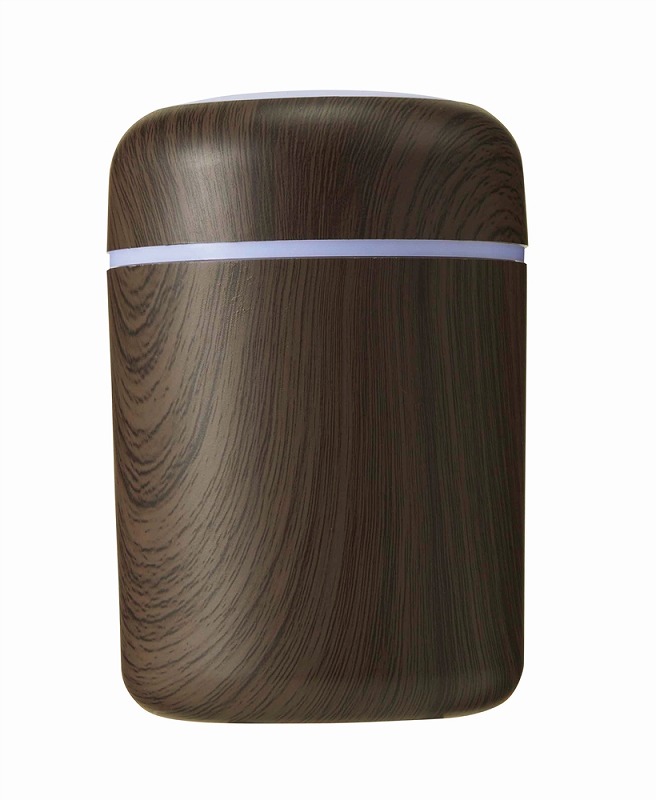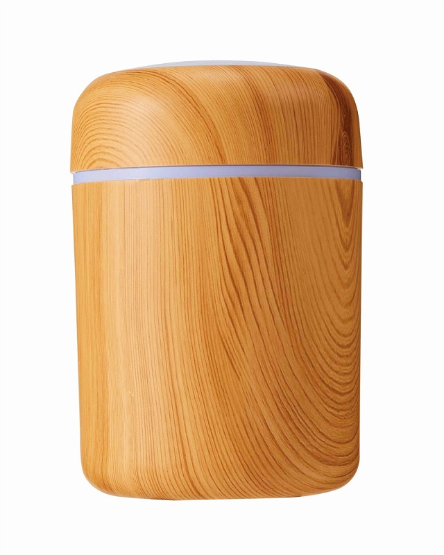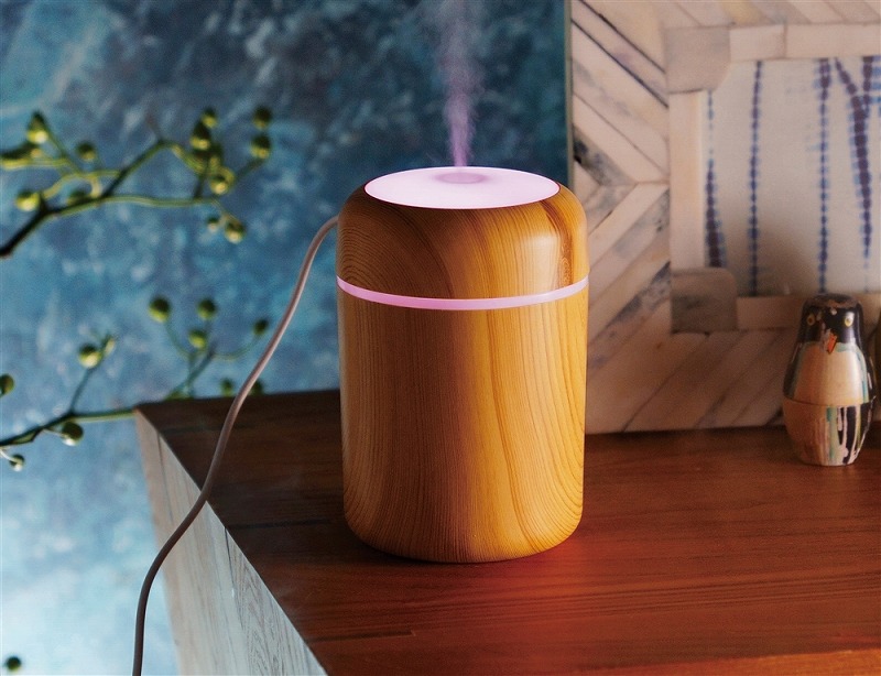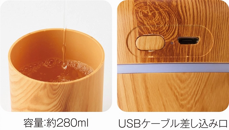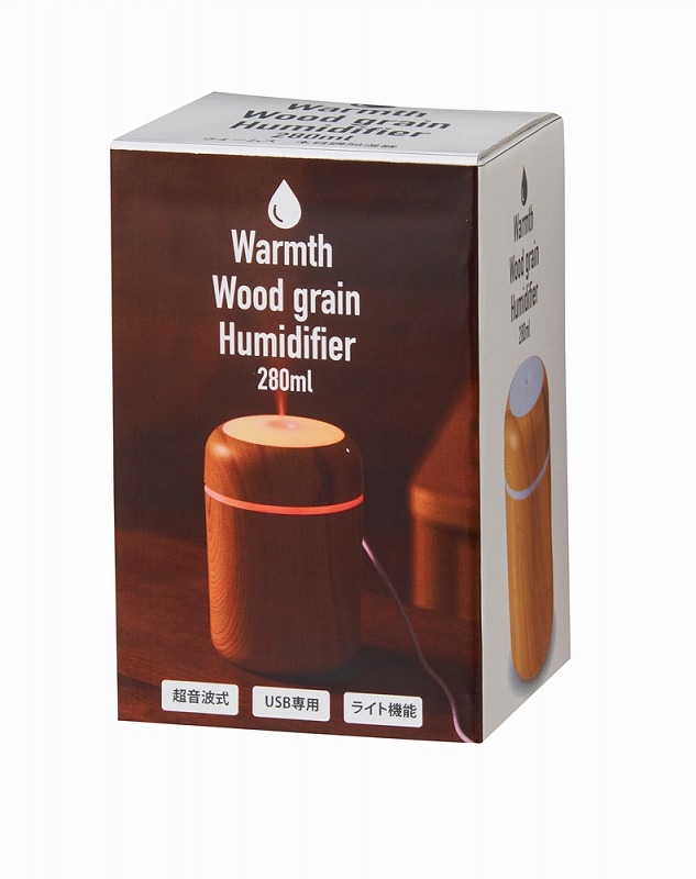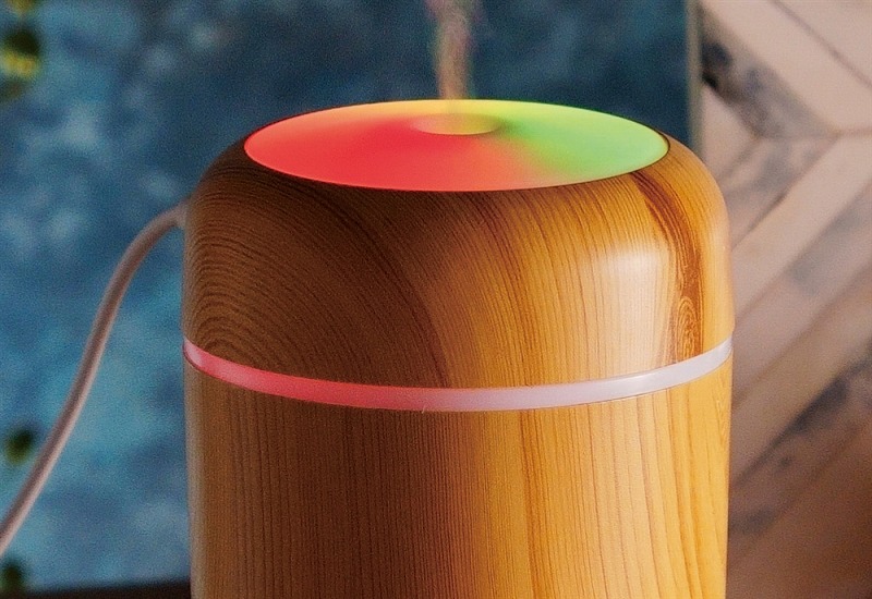 お肌やのどの乾燥対策に必須な加湿器。使用中、本体上部は多色の光が巡るパターンと、ゆっくり色が変わるグラデーションパターンで光ります。本体はナチュラルとダークな2色の木目調カラーのアソート。