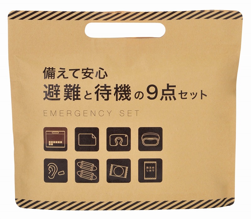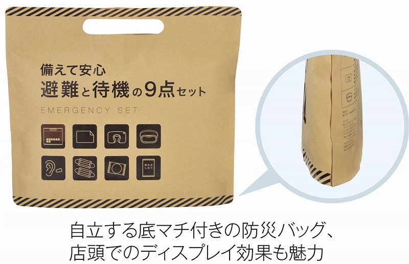 自立する底マチ付きの防災バッグ入り。店頭でのティスプレイ効果も抜群です。車中泊の備えにも。