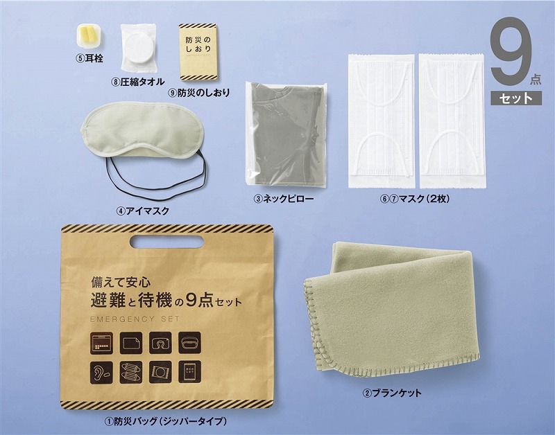 防災バッグ(ジッパータイプ)/紙・OPPフィルム・CPPフィルム ブランケット/ポリエステル ネックピロー/PVC・綿 アイマスク/ポリエステル・不織布・スポンジ・ゴム 耳栓/ポリウレタン(本体) ポリプロピレン(ケース) マスク/不織布・ポリエステル・ポリウレタン・ポリエチレン 圧縮タオル/綿 防災のしおり/紙
